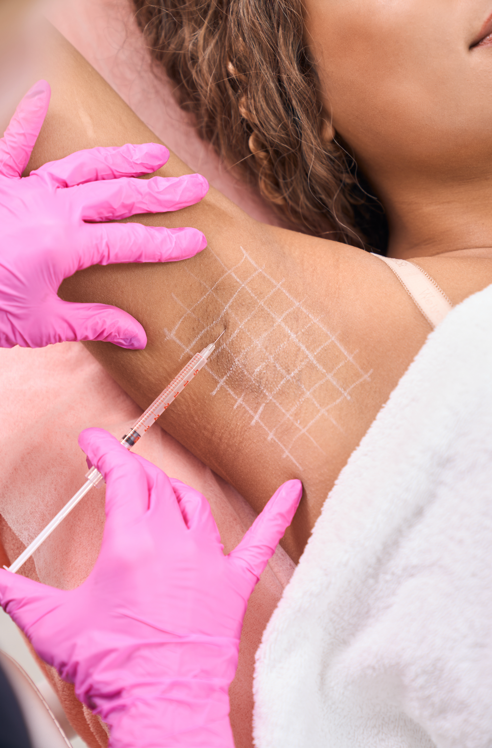 La toxina botulínica tipo A está aprobada por la FDA para el tratamiento de la sudoración intensa en las axilas. Pequeñas dosis de toxina botulínica inyectadas bloquean temporalmente los nervios que estimulan la sudoración.