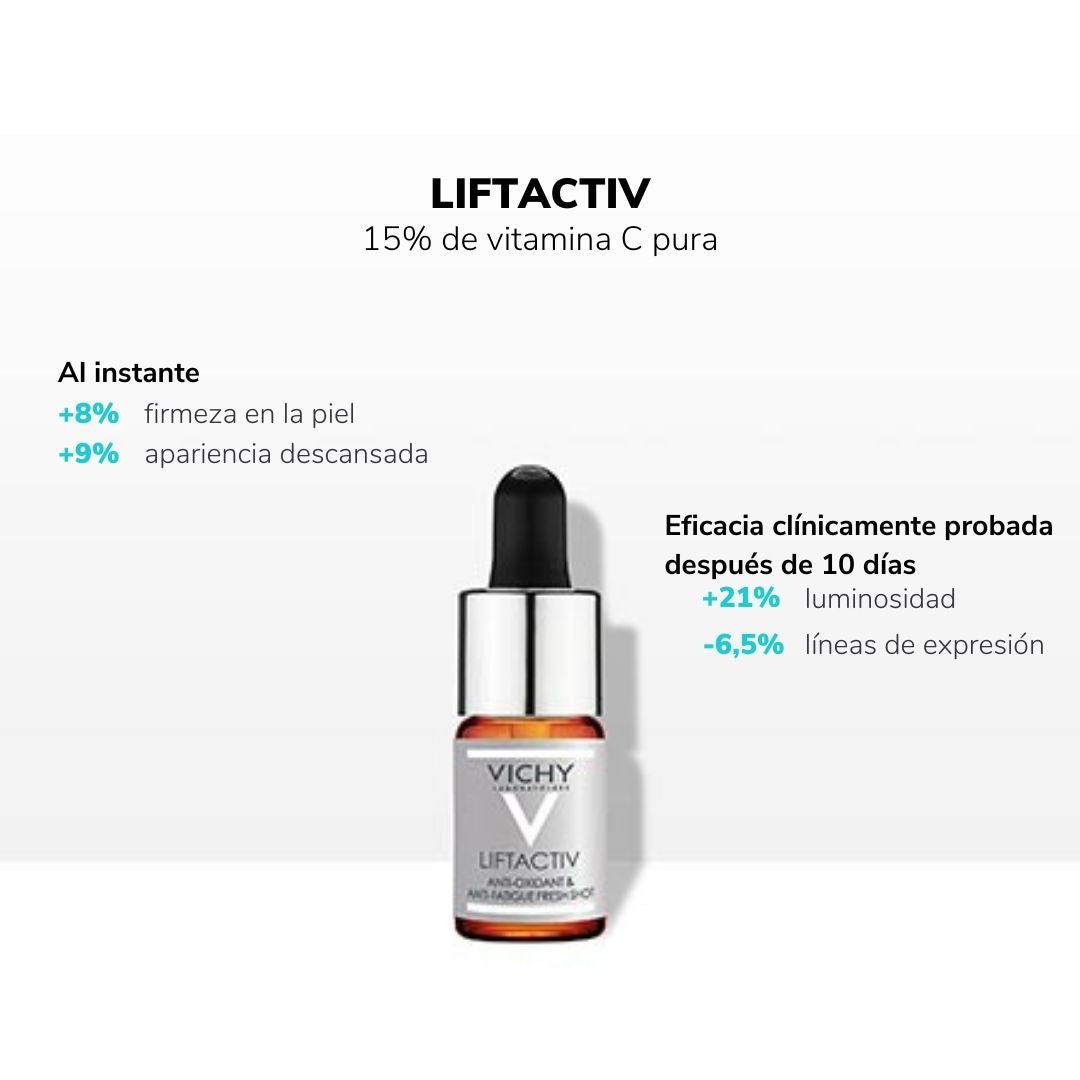 Con un 15% de vitamina C pura, el cuidado Liftactiv Dosis antioxidante es el antídoto anti-fatiga de la piel. Instantáneamente la piel está descansada, tonificada y más firme. Después de 10 días, se ha probado clínicamente que las pequeñas arrugas se reducen y se reaviva la luminosidad de la piel.