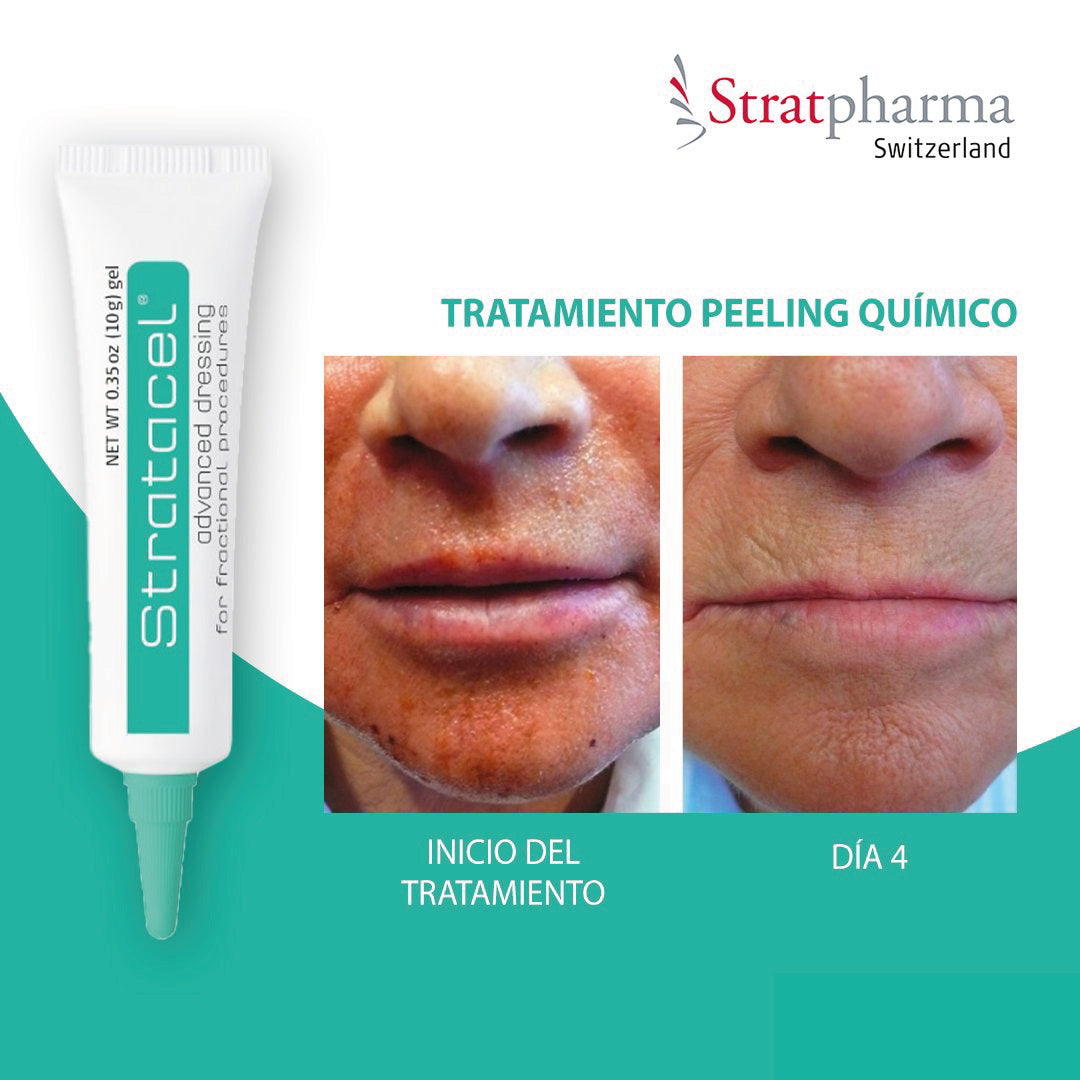 Stratacel es un apósito para heridas avanzado, transparente y semioclusivo que se utiliza después de procedimientos de rejuvenecimiento fraccionado. Fue desarrollado con una viscosidad más baja que facilita su esparcimiento y remoción.